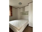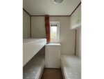 O segundo quarto tem 3 camas e vários armários de armazenamento.