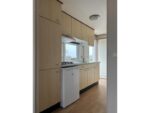 Equipado com fogão a gás, geladeira e muitos armários de armazenamento.